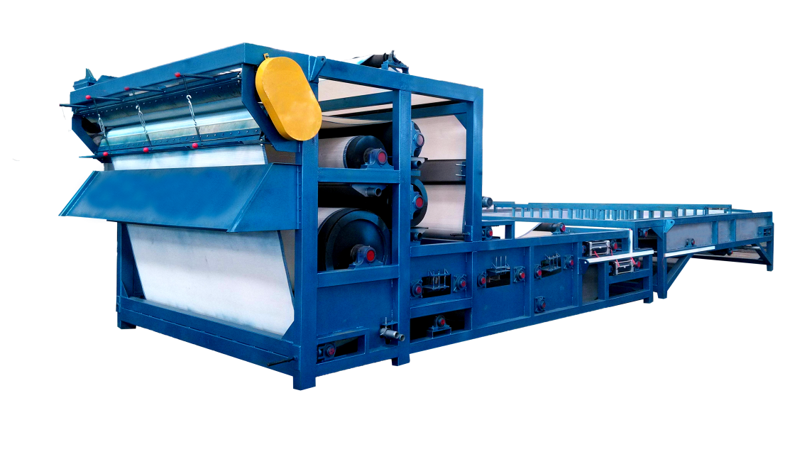 帶式壓濾泥漿脫水機是洛陽隆中重工在引進國外壓濾技術基礎上研制成功的新機型,該設備是通過兩條濾帶纏繞在一系列順序排列、大小不等的輥輪上,利用濾帶間的擠壓和剪切作用,來脫除料漿中水分的一種壓濾設備,具有著能連續作業、自動化程度高、節能、使用維護方便等優點,是一種進行污泥脫水減量化處理的理想設備。